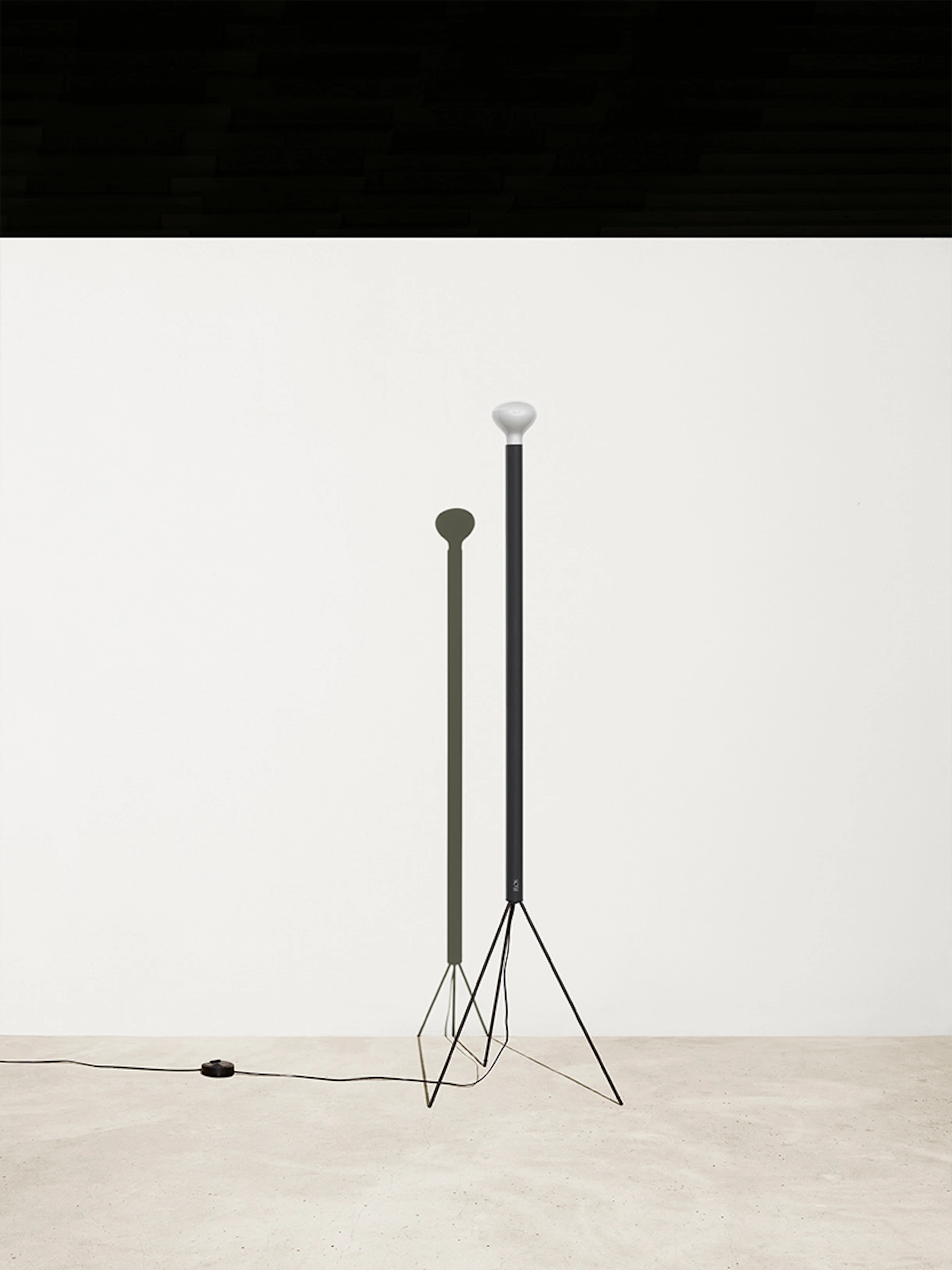 Design de Achille e Pier Giacomo Castiglioni Luminária de piso que fornece luz indireta, o Luminator é composto por um tripé desmontável e um tubo, largo apenas o suficiente para conter o soquete da lâmpada.