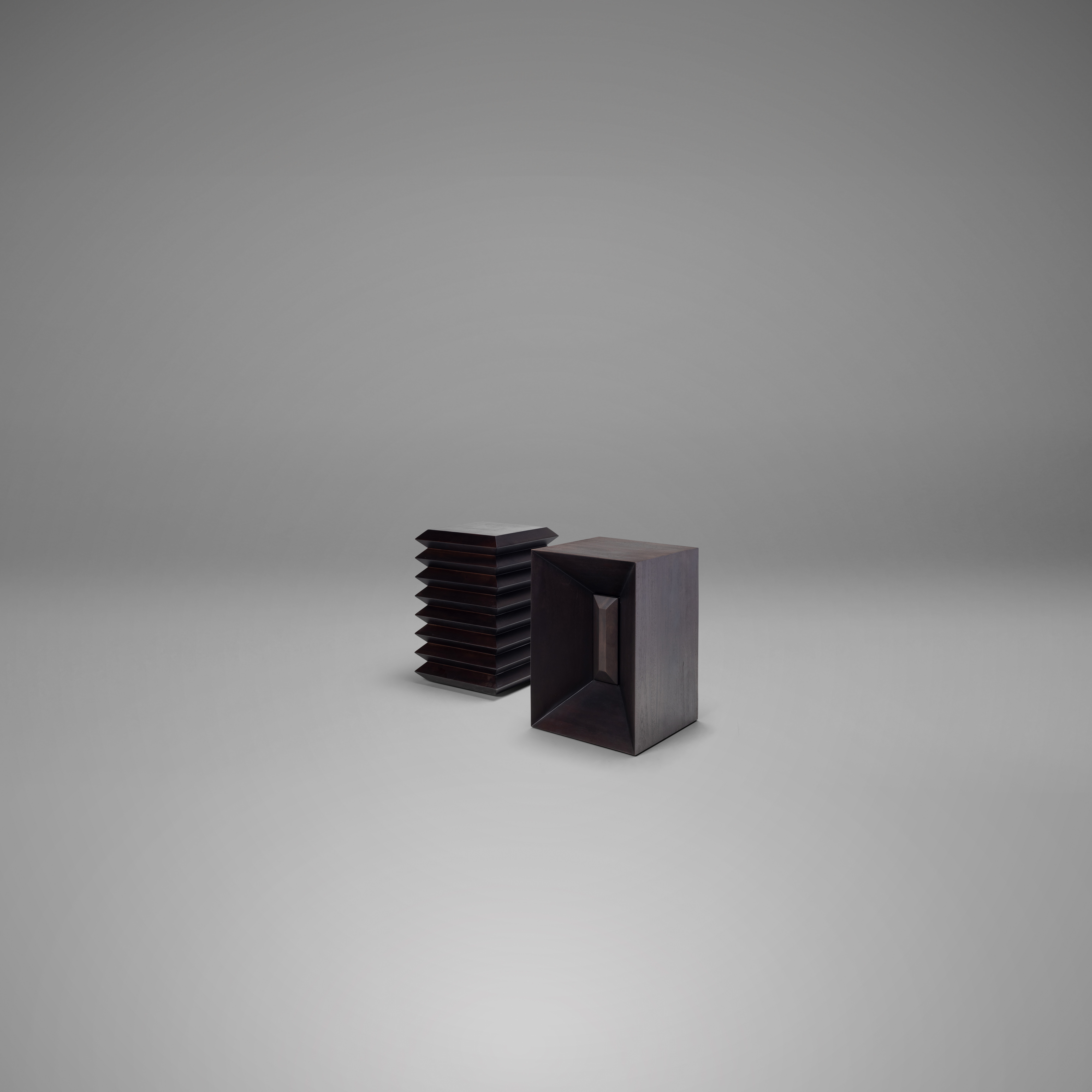 Inspirada no minimalismo oriental, a Mesa de Apoio Âmbar combina elegância e funcionalidade em proporções precisas. Seu formato compacto revela uma frente com reentrâncias angulares simétricas, criando um efeito visual de profundidade e dinamismo. A madeira maciça, tingida e polida, reforça o caráter geométrico do design, ideal para ambientes contemporâneos com personalidade. Versátil e expressiva, a mesa atua como elemento decorativo de vanguarda, seja ao lado de sofás, poltronas ou integrada a composições com mobiliário autoral.