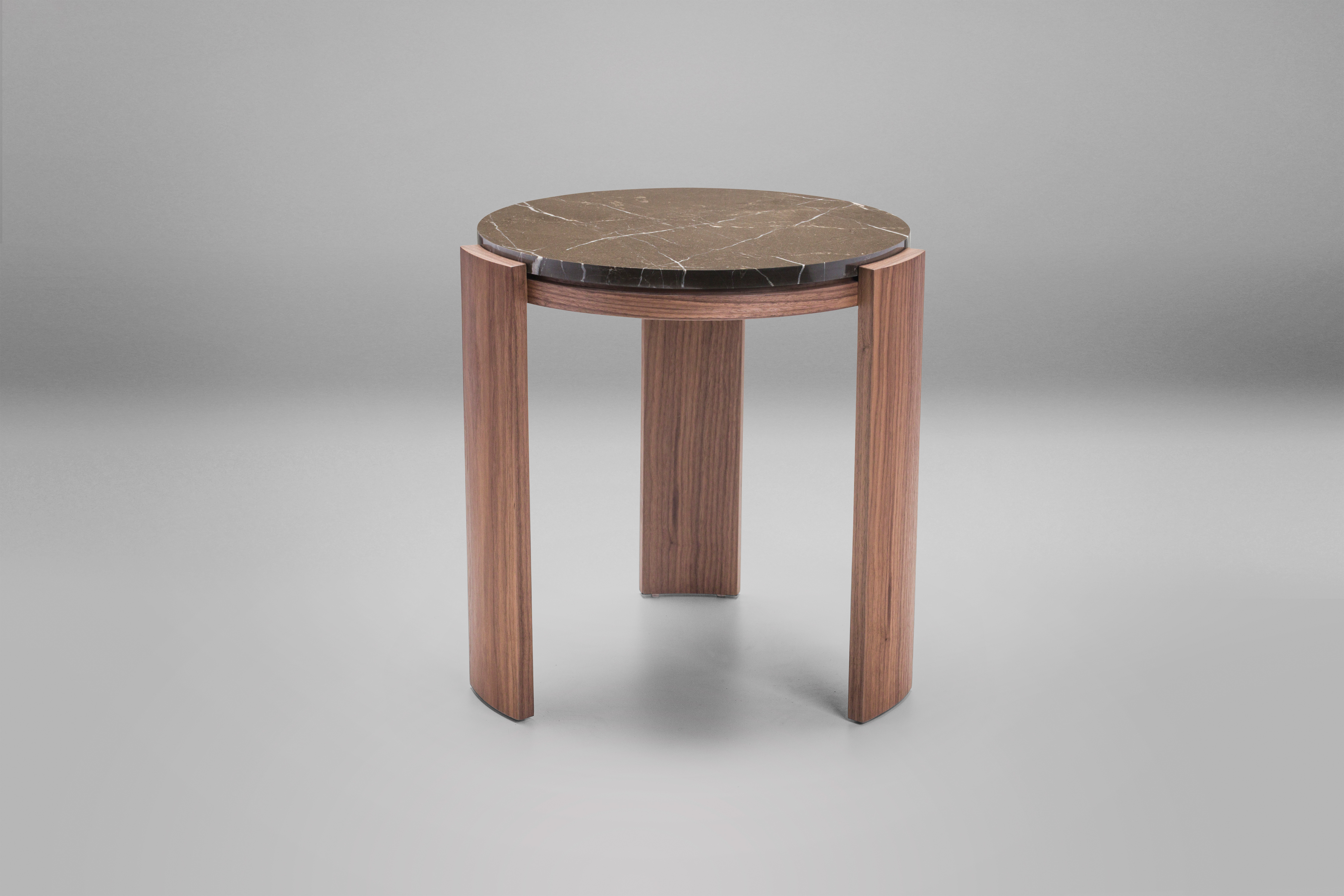A Mesa Lateral Clock Alta une delicadeza e força em uma peça singular. O seu tampo, que pode ser feito em lâmina natural ou mármore, é sustentado por três pés, também em lâmina, que acompanham seu formato circular. Sua superfície parece flutuar acima da estrutura em madeira.