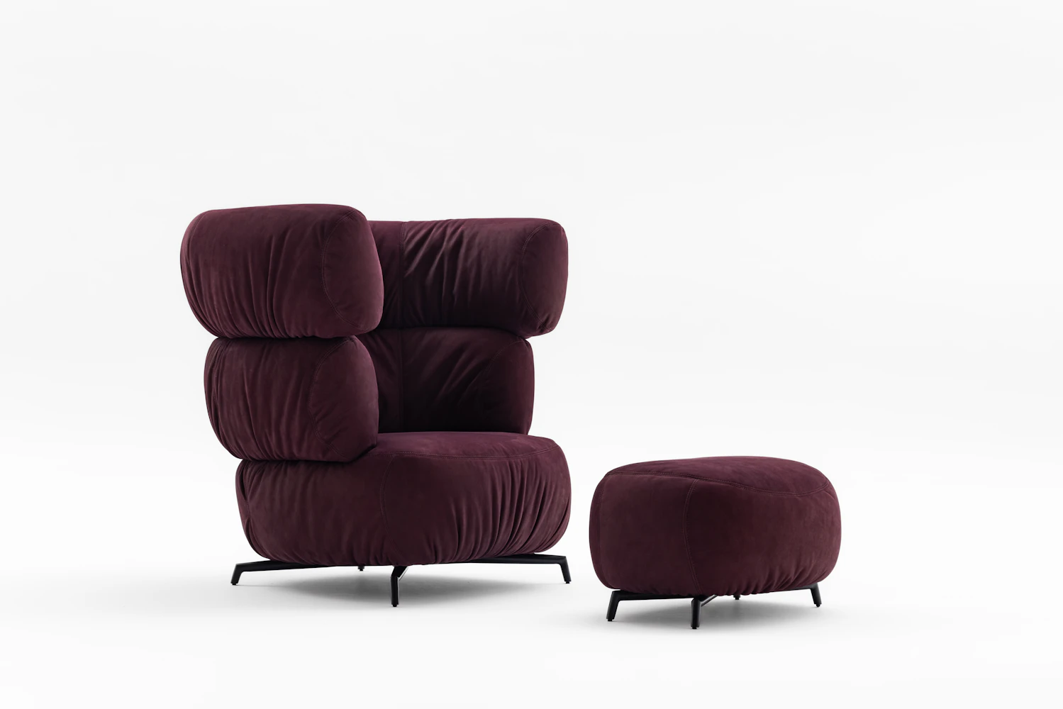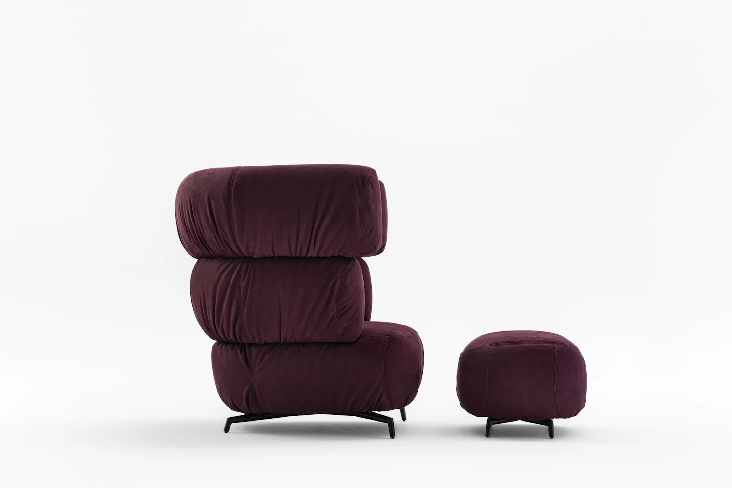 Poltrona de proporções amplas com estofado em gomos sobre base metálica delgada.