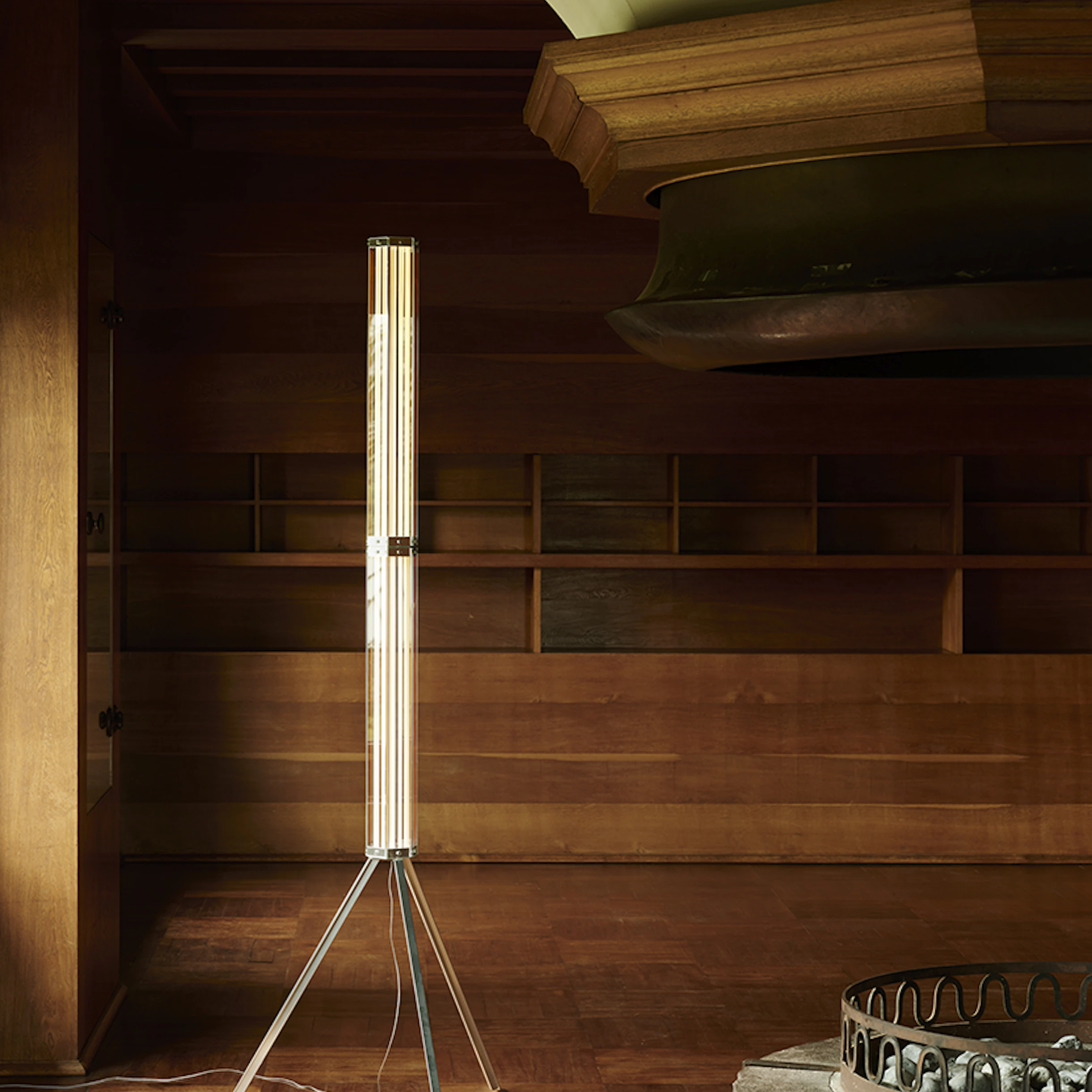 A SuperWire é a primeira família de luminárias modulares desenhada pela Formafantasma para a Flos. Um projeto mágico e poético, com um design essencial mas de grande presença cênica, que remete ao trabalho dos grandes mestres vidreiros do século passado. Feita de vidro plano e alumínio polido, o seu design teve origem no desenvolvimento de uma fonte de luz feita sob medida que emite uma luz quente e homogênea. Composta por um ou mais hexágonos de vidro plano conectados por um elemento de alumínio polido, a SuperWire ilumina toda a sua superfície graças a uma nova fonte: uma fita de LED muito fina, plana, macia e flexível de até um metro de comprimento, que emite uma luz quente e homogênea ao longo de toda a sua extensão e que pode ser facilmente removida para substituição e reparo, algo único no panorama das luminárias de LED sem lâmpadas convencionais. Esta versão de piso é construída com dois módulos de 75 cm de altura, colocados um sobre o outro, apoiados em um tripé de aço, uma homenagem ao histórico Luminator dos irmãos Castiglioni.